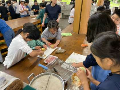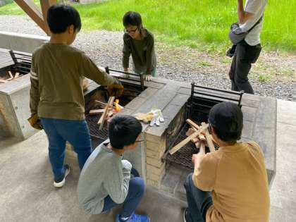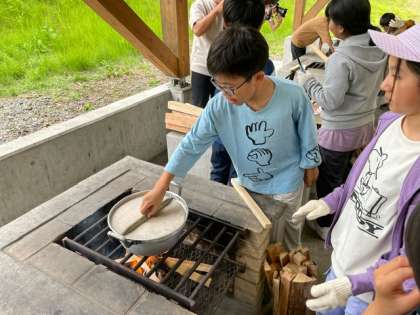 食材を上手に切っています。かまどの火も上手についています。仕上がりが楽しみです。
