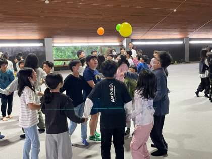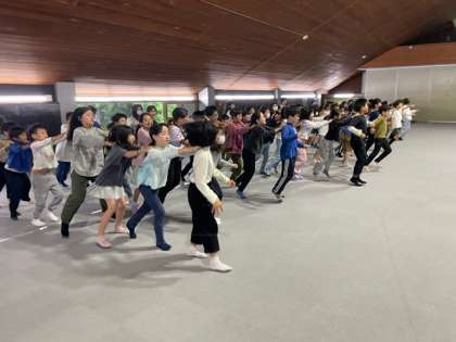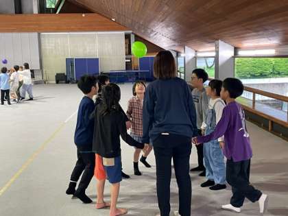 コースター作りが終わったので、村の会堂で行動班対抗のレクリエーション大会が始まりました。班で協力してゲームを楽しんでいます。