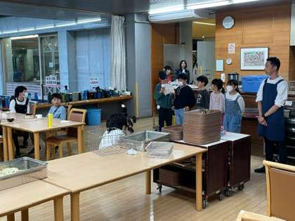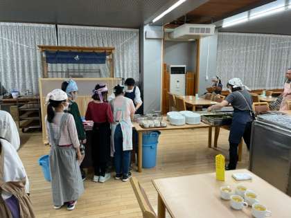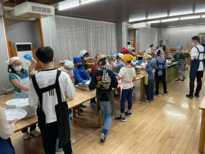 食堂での夕食の準備を食事係がしています。手際もよくなってきました。