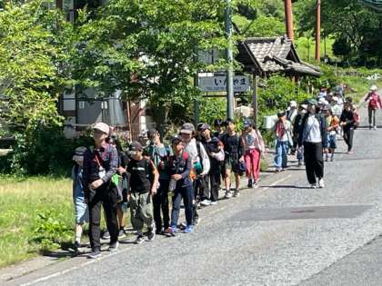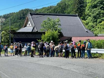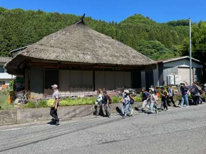 村巡りを続けています。茅葺の古民家、ブルーベリー畑、田んぼなど説明を聞きながら歩いています。