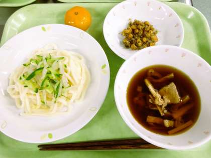 冷やしうどん 牛乳 じゃこ入り磯香豆 くだもの(特別栽培 冷凍みかん)