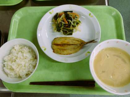 麦ごはん 牛乳 魚の梅肉焼き 野菜のあえ物 白いみそ汁