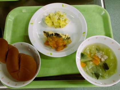ココアパン 牛乳 魚のエスカベージュ 粉ふきいも 豚とキャベツのスープ