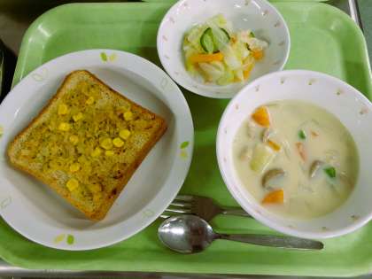 ツナトースト 牛乳 クリームスープ キャベツのサラダ