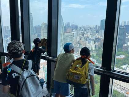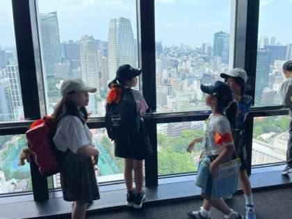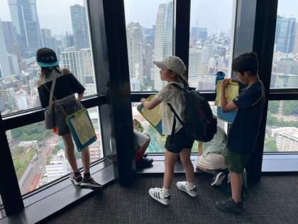 展望デッキでは、グループごとに東京タワーから見える景色を楽しんでいます。