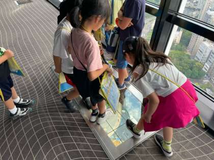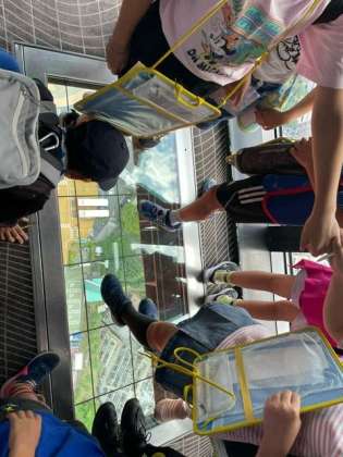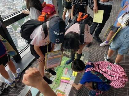 ガラスの上から地上の様子を見ています。乗ってきたバスがミニカーのようです。