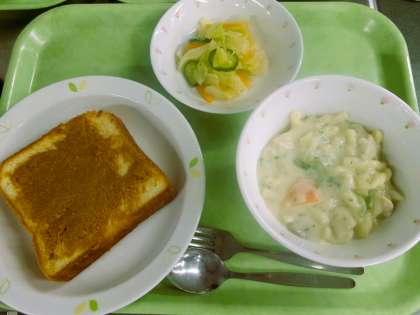 きなこは、何から作られているか、知っていますか。きなこは、大豆を炒ったものを粉末に加工したものです。今日は、国産の小麦粉で作った食パンに、きなこと砂糖、バターを練り合わせたものをぬってオーブンで焼きました。給食室の中は、きなこの香ばしい香りが漂っています。香り、味を確かめながらいただきましょう。