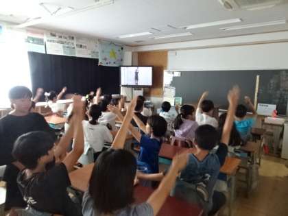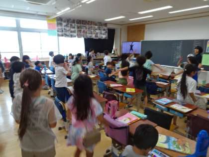 ここのところ、暑さで校庭で遊べない日もあります。今日の体育朝会は、そんな時、教室でもできる「体と頭」を使った運動に挑戦です。見本の先生の動きをまねしますが、なかなか上手にできません。少しずつできるように挑戦していきましょう。