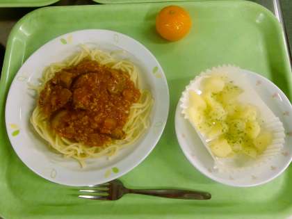 なすミートスパゲッティ 牛乳 じゃがいものチーズ焼き くだもの(冷凍みかん)