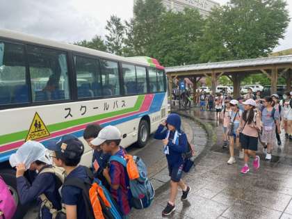 新庄駅からはスクールバスで舟形小学校まで向かいます。少し雨が降っています。