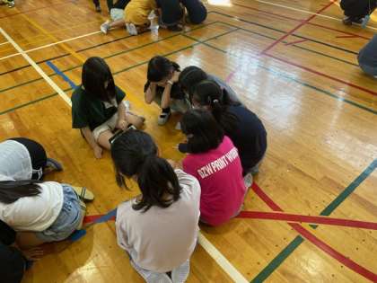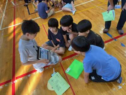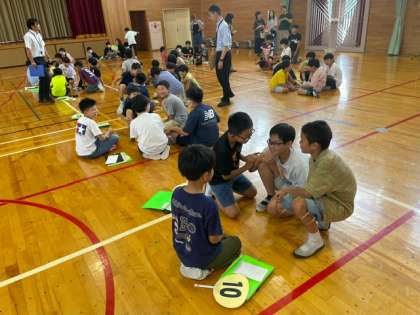 5年生の活動班での交流タイムです。自己紹介をしたり、舟形クイズをしたりしています。