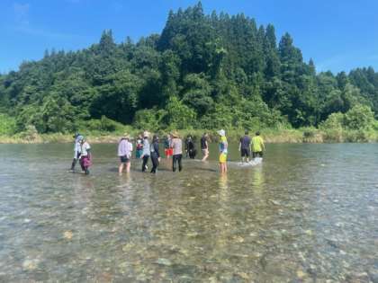 川の中には、安全のためのロープをはってくれています。ライフジャケットの準備もしてくれています。天気はどんどん良くなっていて気温も上がっています。熱中症にも気をつけて活動します。