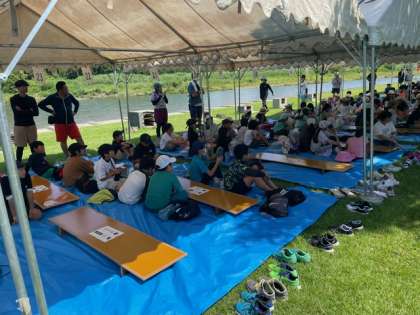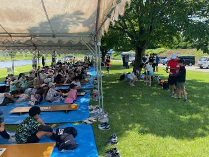 全ての子どもたちが集まったので朝の会をしています。暑いのでテントの中で話を聞いています。