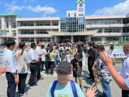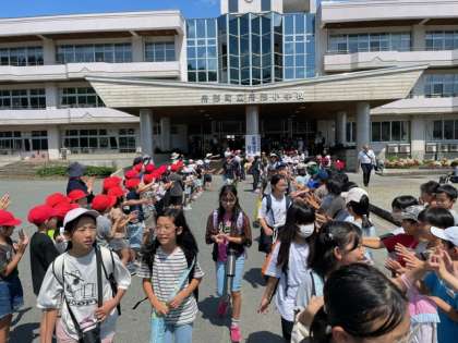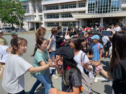 舟形小のみなさんの見送りの中、スクールバスに向かいます。