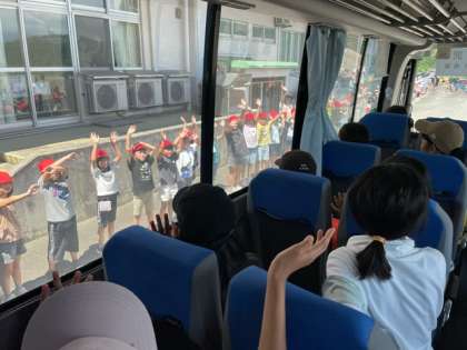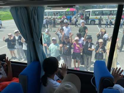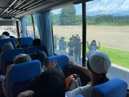 スクールバスで新庄駅に向かいます。舟形小の皆さんがバスに向かって手を振ってくれています。