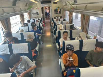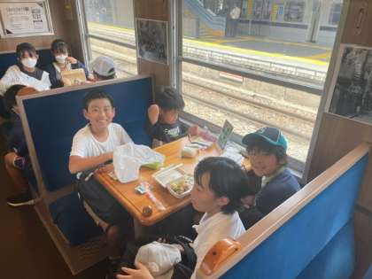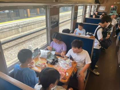 SLの中でお弁当を食べています。お弁当を食べ終わったころ、出発になります。