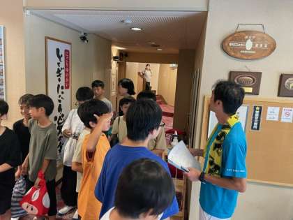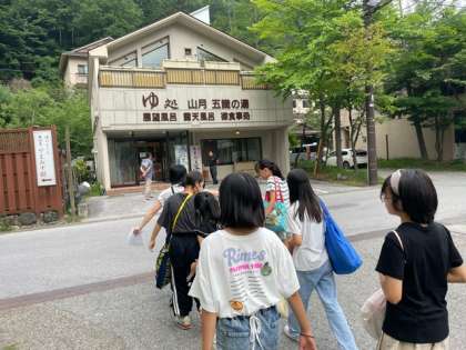 1日めの入浴が始まりました。今日は、男子が本館のお風呂、女子は、本館から少し歩いて行く「ゆ処」のお風呂に入ります。どちらも温泉です。汗をしっかり流しましょう。