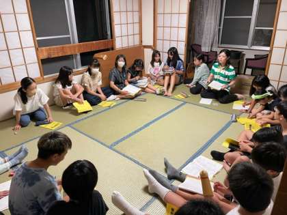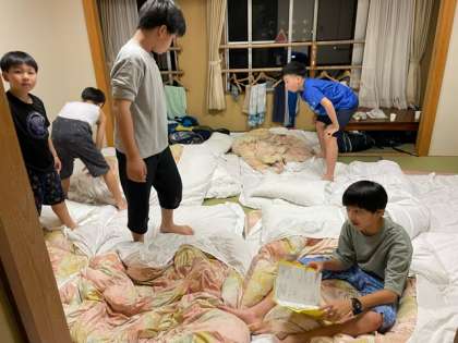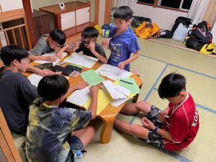 それぞれの部屋での部屋会、室長と班長の反省会、就寝の準備をしています。今日の反省を明日に生かしていきましょう。明日は、ハイキングです。しっかり休みましょう。おやすみなさい。