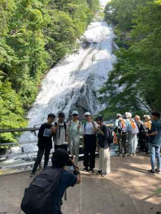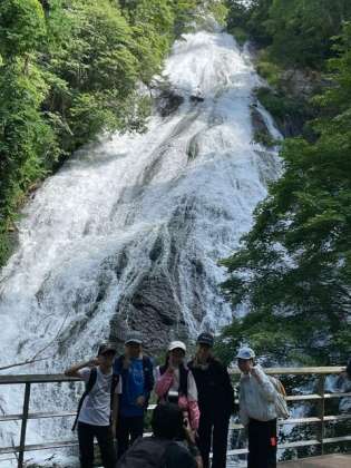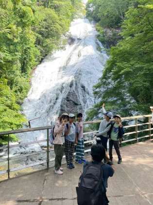 湯の湖を半周して、湯滝に到着。滝をバックに行動班ごとに写真を撮ります。この後、トイレ休憩をしてバスで三本松遊園に向かいます。