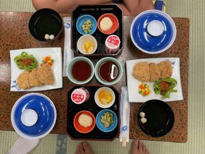 ホテル山月さんでいただく最後の夕食です。日光湯波も出ています。ハイキングでお腹もぺこぺこです。しっかり味わって食べましょう。いただきます。