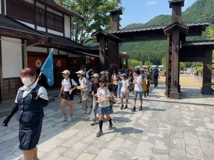 順調に進んで予定より早く日光江戸村に到着。関所を通って集合場所まで行きます。準備場所から、行動班ごとに見学しています。