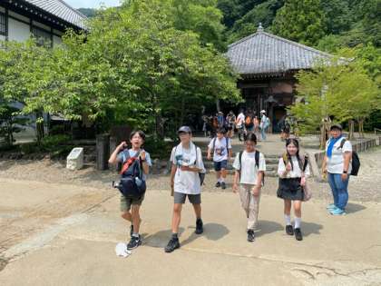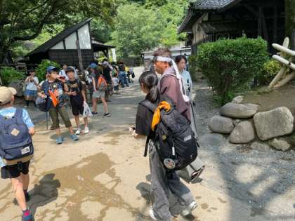 暑い中ですが、みんなで楽しんでいます。謎のお侍と一緒に歩いている班もあります。水分補給、しっかりして見学を続けましょう。