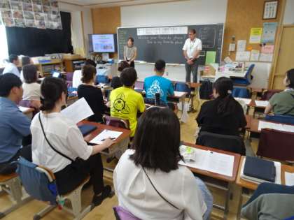 子どもが下校した後の教室では、先生方が「外国語活動研修」を受けています。ALTを派遣してくれている業者から講師の先生を招いての研修です。子どもになった気持ちで先生方は楽しく研修していました。研修したことを子どもたちに指導に生かしていけるようにしましょう。