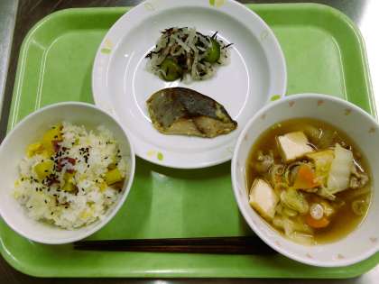菊花ごはん 牛乳 魚のみそ麹焼き きゅうりの酢の物 生揚げ汁