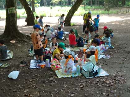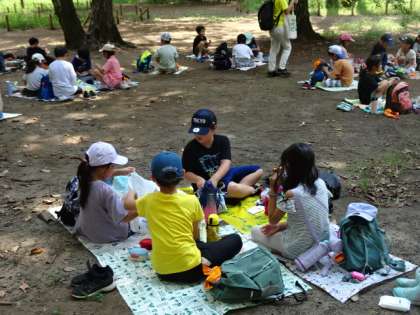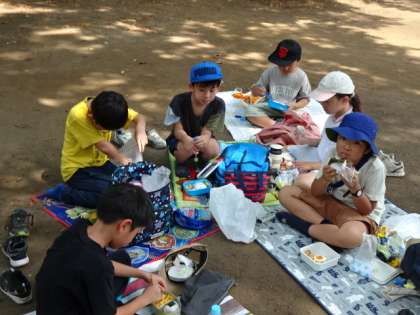 天気が良いので、日陰のある場所に移動してお弁当を食べました。美味しいお弁当ありがとうございました。みんなにこにこしながら食べています。