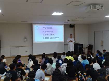社会科で水産業の学習を始めている5年生。ここ数年、ヒラメの養殖を行っていますが、今年は猛暑の影響もあり、一ヶ月遅れではじめます。今日は講師の先生から、ヒラメの志立方についての事前の指導がありました。今年もみんなで協力してヒラメを育てていきましょう。