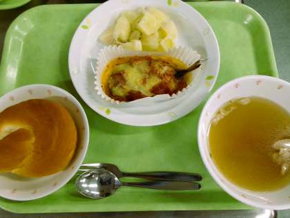 ミルクパン 牛乳 魚のピザ風 ジャーマンポテト コンソメスープ