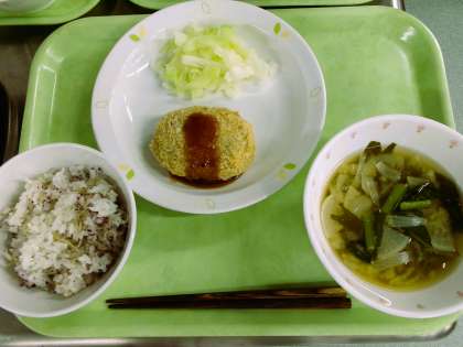 給食室で、ていねいに作ったコロッケ、おいしくいただきましょう。