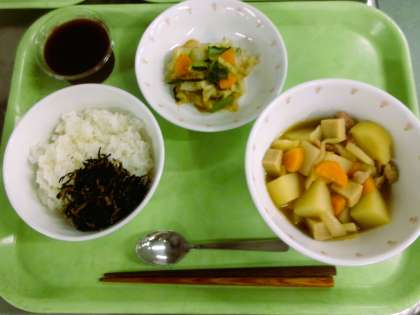ごはん 牛乳 ふりかけ 肉じゃがうま煮 キャベツのポン酢あえ ぶどうゼリー