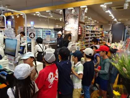 店内には商品を並べている人、パンやお弁当を作っている人、笑顔でお客さんに対応するレジの人、お店にものを運んできている人など様々な働きをしている人がいることを知り、子どもたちは、「知らなおことがたくさんあって楽しかった!」と満足そうにしていました。これからの学習で、見学して学んだことを整理しながら、スーパーマーケットにたくさんの人が来る理由について考えていきます。
