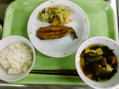 今日は、千葉で千葉で水揚げされたいわしを使い、かば焼き風に、揚げて、甘辛いたれをからめています。ごはんと一緒にいただくととてもおいしいです。いわしの写真を配膳室前の掲示板にはっています。どんな魚か見てください。