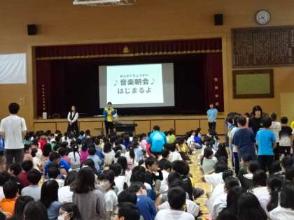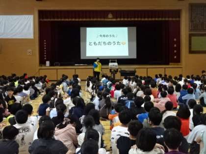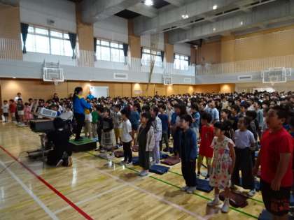 体育館で10月の音楽朝会を行いました。10月の歌は、11月の秋季舟形交流で歌う「ともだちの歌」です。舟形町を訪れた5・6年生だけでなく全校で舟形小の子を迎えるために心を込めて歌います。本番は、音楽クラブの演奏で歌うことになっています。音楽クラブの人も練習頑張りましょう。