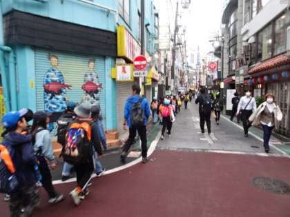 朝まで雨が残り心配された4年生の遠足ですが、子どもたちが登校した頃には雨もあがり、無事出発しました。久しぶりの電車に乗っての校外学習、今日は、高尾山の登山です、まずは、井の頭線の下北沢駅を目指します。