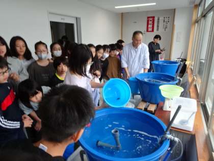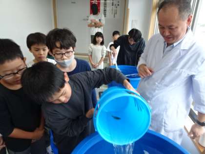 ヒラメの養殖に挑戦する5年生。いよいよ今日が受け入れ式です。講師の齋藤先生からお世話の仕方を教わったうえで各クラス5匹の稚魚を水槽の中に放しました。代表の5名の子もその他の子も興味津々です。大切な命、みんなで協力してお世話をしていきましょう。