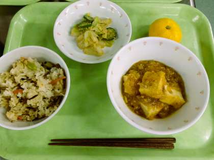 磯おこわ 牛乳 生揚げそぼろあん ごま酢かけ くだもの(みかん)