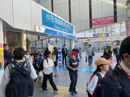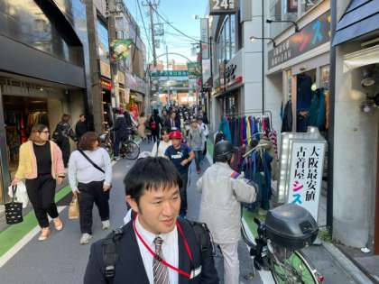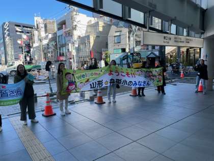 予定通りに下北沢駅に到着。たくさんの保護者の方が横断幕やうちわをもって歓迎してくれています。下北らしい南口の商店街を通って代沢小学校に向かいます。もう少しで学校です。