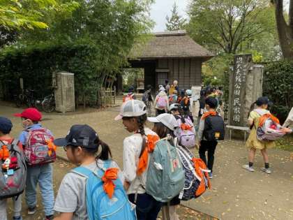 梅丘通りから環七に入って世田谷区を南下。目黒通りから多摩堤通りを多摩川にそって走って次大夫堀公園に到着。バスの中では、車窓から町の様子を見たり、世田谷クイズを楽しんで過ごしました。