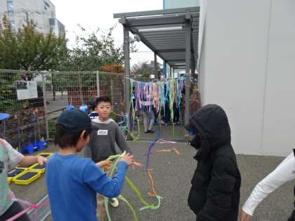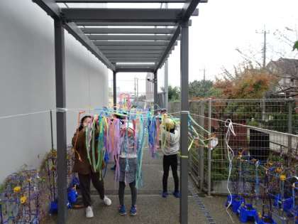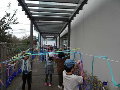 4年1組の子どもたちが図工の時間、橋場門の柱を利用して、スズランテープをみんなでつなげる造形遊びをしています。2組は14日(木)に行いました。3組は20日8水)の3・4校時に行う予定です、色とりどりのスズランテープが風に吹かれた動いたり、様々なつなぎ方を工夫したりその時だけの作品ができ上ります。