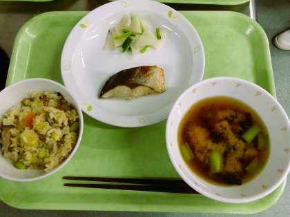 週末の日曜日、11月24日(いい にほんしょくの ひ)は、だしで味わう和食の日です。今日の給食は、昆布とかつお節でしっかりとだしをひいています。だしは、和食の味の基本となります。そして、環境のことも考えて、都内で育った野菜(こまつな 生しいたけ)も使いました。配膳室前に、だしで味わう和食の日のポスターをはりました。ぜひ、読んでみましょう。
