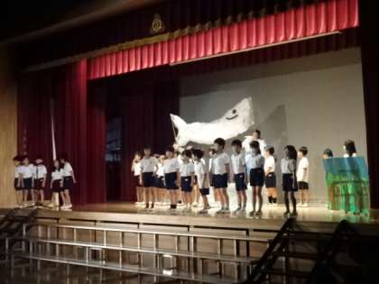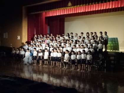 プログラム2番、1年生の「くじらぐも」です。国語で学習した「くじらぐも」、みんなで大きな雲に乗って冒険です。元気な歌声にも注目です。
