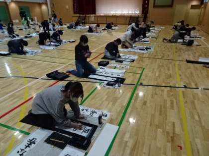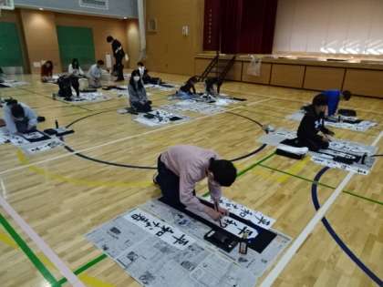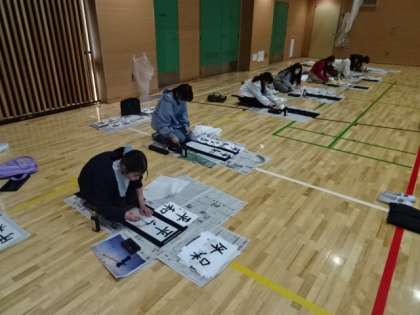 体育館での書初め会が始まりました。トップバッターは6年生です。小学校最後の書初め、みんな集中して取り組んでいました。「平和な春」が訪れますように。