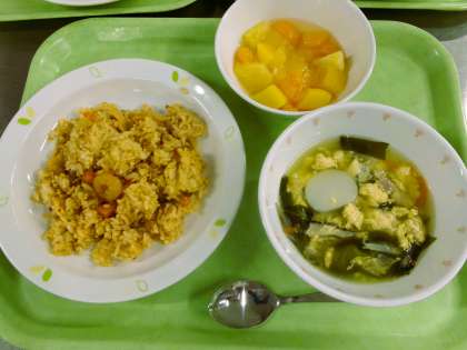 キムチは、白菜などの野菜を、塩、にんにく、唐辛子、魚介の塩辛などのヤンニョムとあえた朝鮮半島の代表的な漬物です。今日は、チャーハンにしました。スープのトックも朝鮮半島のもちです。トックは、白玉もちとは違い、もち米でなく、うるち米(ごはんのお米)で作ります。先週の白玉雑煮と食感の違いを感じながら食べてほしいなと思っています。