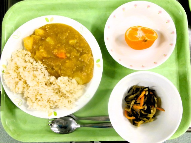 〇本日の献立〇カレーライス 牛乳 ひじきのサラダ くだもの(ぽんかん)