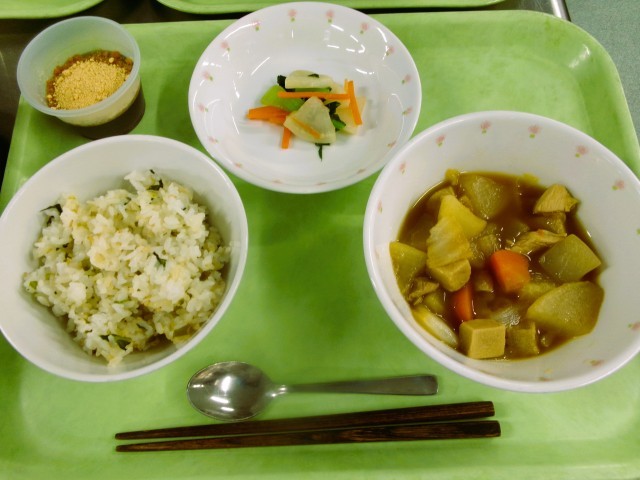 菜めし 牛乳 鶏肉と大根のうま煮 野菜のごま風味 黒糖寒天
