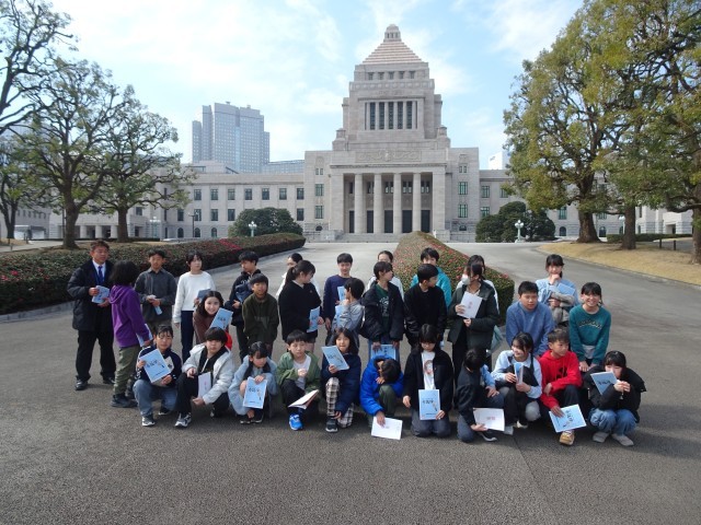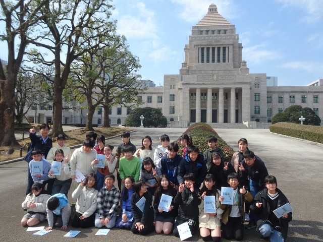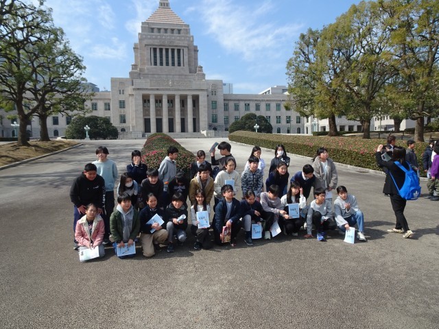 議事堂の見学を終え、都道府県の木を見てからクラスごとに国会議事堂をバックに記念写真を撮りました。政治の学習は1学期に終えていますが、卒業を前に体験や見学ができた少し政治が身近になったと思います。