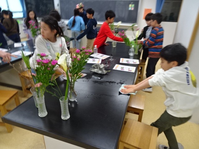 今年度最後の「花を生ける日」の活動がありました。4年3組の子どもたちが全学級のお花を生けてくれました。片付けまで協力してしっかりとできていました。1年間、ご指導いただいたワンコインクラブの皆様、ありがとうございました。
